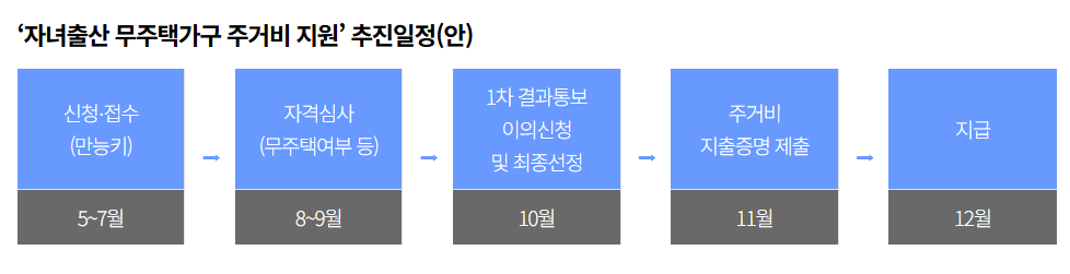2025년에는 1월 1일부터 6월 30일까지 출산가구를 대상으로 하며, 5월부터 7월까지 ‘몽땅정보 만능키’ 누리집을 통해 신청할 수 있다. 신청을 희망하는 무주택 가구는 확정일자가 날인된 임대차계약서 등을 구비해 ‘몽땅정보 만능키’를 통해 신청하면 된다.